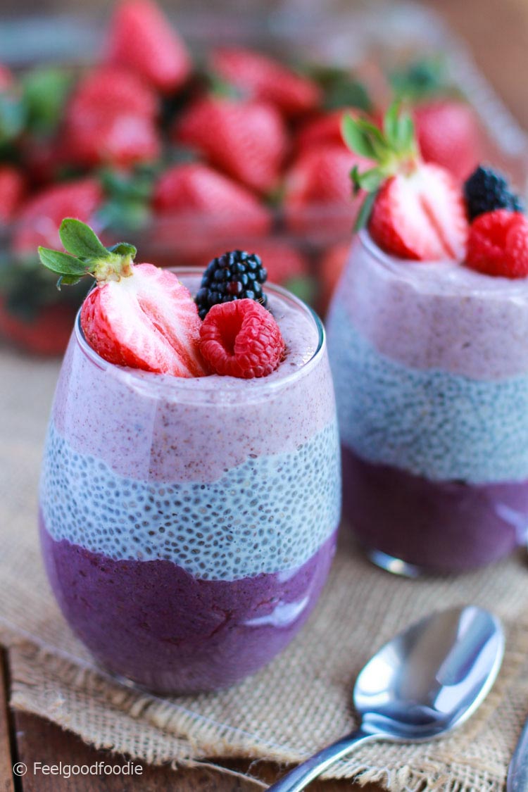 Peanut Butter and Jelly Chia Pudding Compote1 cup wild blueberries (frozen or fresh)1 Tbsp orange juice1 Tbsp chia seedsChia Pudding1 cup unsweetened plain almond milk1/2 cup light coconut milk (Use canned // or sub more almond milk)1 tsp vanilla (optional)1-2 Tbsp maple syrup (to taste)3 Tbsp natural salted peanut butter (creamy or crunchy // plus more for serving)1/3 cup chia seedsFresh blueberries (optional // for topping) To a small skillet or saucepan, add the blueberries and orange juice. Warm over medium-high heat until bubbling. Then lower heat to medium and cook for 2 minutes - stirring ccasionally. Remove from heat and add chia seeds. Stir to combine.Divide the compote between three (amount as original recipe is written // adjust if altering batch size) small serving dishes (like these from Weck), and set in the refrigerator to chill.In the meantime, add almond and coconut milk to a blender, along with vanilla (optional), maple syrup, and peanut butter. Blend on high to fully combine. Taste and adjust flavors as needed, adding more maple syrup for sweetness or peanut butter for saltiness.Add chia seeds and pulse a few times to incorporate, being careful not to blend as you want the chia seeds left...