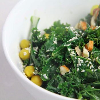 In a bowl, add chic peas and top with the steamed kale and Swiss chard. Sprinkle with sesame seeds and almonds pieces.